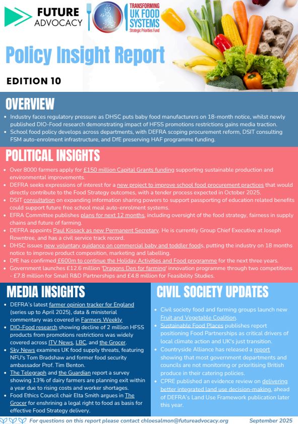 Take a look at the latest policy insight report from our impact and engagement consultants Future Advocacy, outlining political and media insights and civil society updates relevant to the Transforming UK Food Systems Programme.